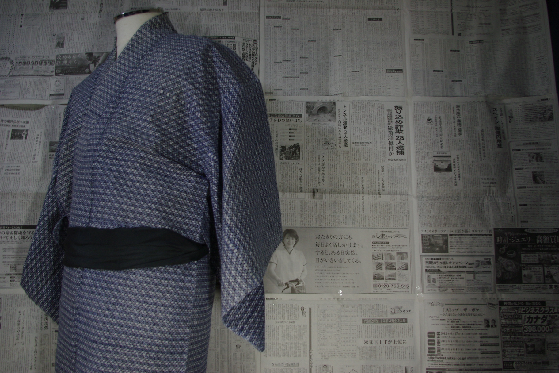 男の浴衣で、古着として汗ジミや破れのあるものとして安く販売されていたものを、着物の商品知識を深めるために、時間をかけて解(ほど)いてみました。私自身アパレルメーカー在職中に、商品解体と称して、某大手ミシンメーカー指導のもと、既製スーツをミシン目一つ一つひろって解いた経験があるのですが、今回もそれと同じ方法を着物でも試み、解いてみました。