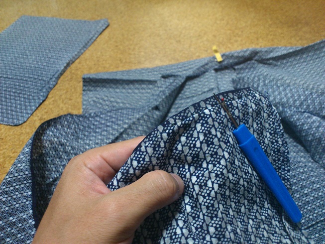 *今回解いた浴衣。お役目御苦労さまでした。東袋か何かの素材として活用しようと思います和裁というのが、どういう工程で縫われているのか、現在その知識が無いので、縫線が他の部分とかぶっていない袖から外して行きました。今回の浴衣は、手縫いではなく、和裁専用のミシンを使っていると思うのですが、縫い線の間隔も思いのほかあいており、解くのは、スーツのそれにくらべて楽だったように思います。着物は解いて、洗って、また使う(洗張り)という風習がここにうかがえます。